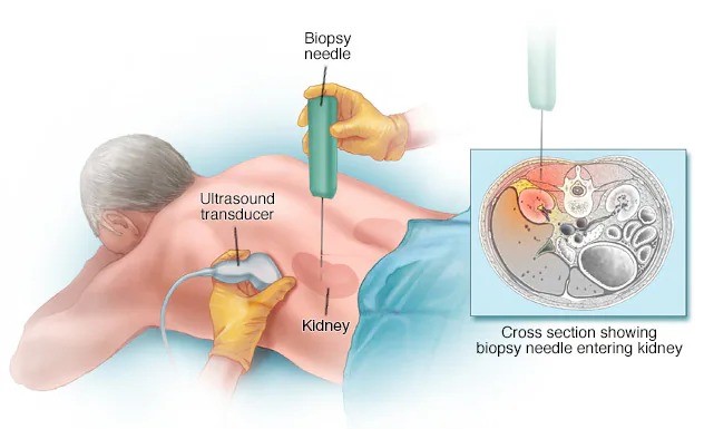 A kidney biopsy is a medical procedure in which a small sample of tissue is taken from the kidney for examination under a microscope. It is often used to help diagnose kidney diseases, assess the severity of kidney damage, or determine the cause of abnormal kidney function. The biopsy can provide crucial information about conditions such as glomerulonephritis, kidney transplant rejection, or other kidney disorders.